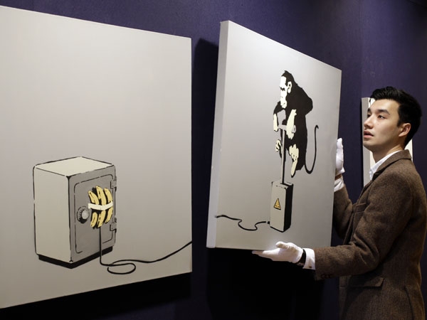 Ambas obras marcaron precios por encima de las estimaciones que había hecho la casa de subastas. En Monkey Detonator, Banksy presenta dos lienzos cuadrados de 76 centímetros que muestran una caja fuerte y un chimpancé activando el mecanismo de unos explosivos. Kids on Guns, una de las imágenes más reconocibles del artista callejero, presenta la silueta negra de dos niños unidos por un corazón rojo, de pie sobre una montaña formada por armas.