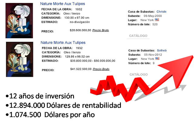 Veamos algunos ejemplos de rentabilidad en obras de prestigio, en este caso a modo de ejempo una obra de Picasso fue comprada en 28.606.000 Millones de Dólares, 12 años después fue vendida a 41.522.500 Millones de Dólares dando una rentabilidad de 12.8% anual.