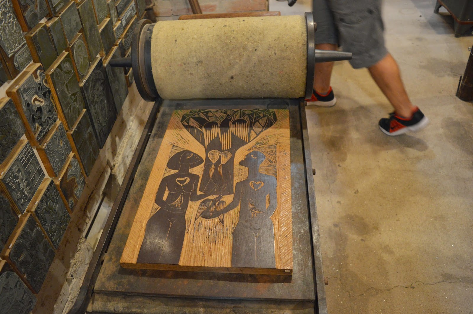 5.- Luego se limpia la plancha, se calienta y se entinta, sequita lo sobrante y se coloca en la prensa sobre la paltina junto con el papelpreviamente humedecido sometiéndose a la presión necesaria para lograr laimpresión.